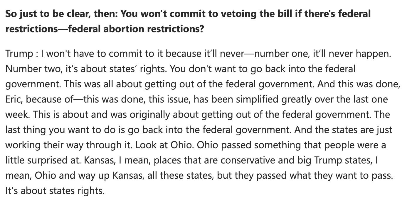 Trump, a skilled politician in all the most vexing ways, bobbed and weaved on the question of whether he would sign a federal law banning abortion care, or instituting limitations on that care that would essentially end all legal abortion in the United States. He said it didn’t matter if he would sign such legislation because Republicans would never have the filibuster-proof 60-seat Senate majority required to pass such a bill. That many Senate Republicans have spoken openly about killing the filibuster to push a nationwide abortion ban to the president’s desk did not enter this equation, for whatever reason.