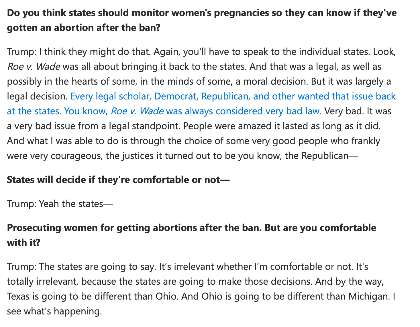 We got a heavy dose of that good faith this week with Donald Trump’s TIME interview, in which he said he would not stop state governments from tracking women’s pregnancies and punishing them for seeking or obtaining abortion services. In trying to deflect and maintain the powerful incoherence of fascism, Trump said he would be hands-off if and when state-level officials created a Handmaid's Tale reality in which the government is aware of every pregnancy and its progress.