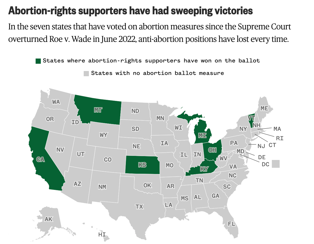 Hell, an Alabama Democrat in March won a special election by 25 points after making abortion rights and IVF access central to her campaign. A pro-abortion ballot measure passed easily in Kansas in 2022! Kentucky voters two years ago said no to a proposed anti-abortion change to the state's constitution! Nowhere in the nation are their anti-abortion majorities. They are a tiny and determined and well funded lot.