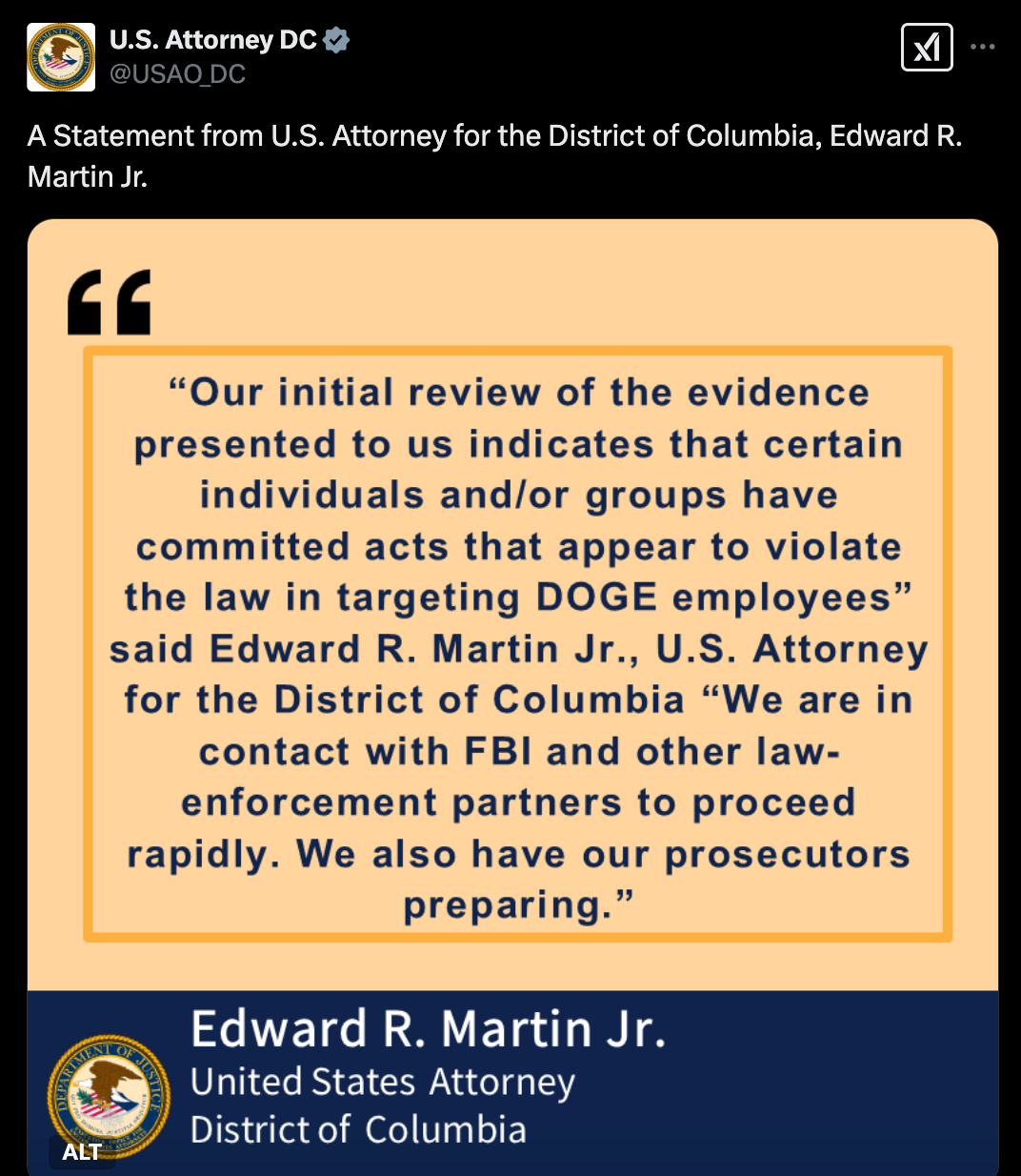 What appears to be the end – however temporary – of constitutional government means anyone who angers the American sovereign (Musk) risks legal consequences from the government he now controls. After the brave journalists at Wired – a publication we should support while most mainstream outfits bend to fascist terror – published the names of the Musk interns who had seized control of the nation’s payment systems, U.S. Attorney for the District of Columbia, Edward Martin released a statement pledging his office would go after anyone who published the names of the Musk interns who had done the coup, or interfered with their work in any way. Martin’s statement was a threat against anyone who would so much as dare to stand in the way of Musk’s fake department while it dismantled the U.S. government.
