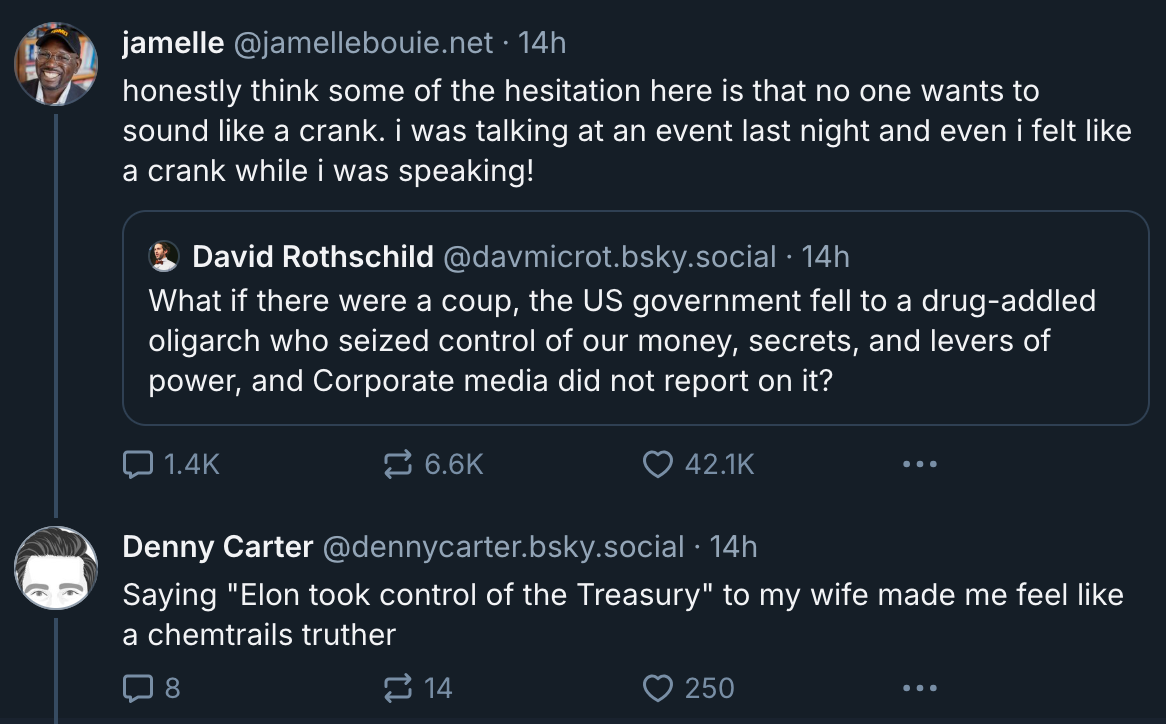 After seeing requests in my mentions for the names of the Musk worker bees, I considered listing the DOGE workers’ names on Bluesky but thought twice about it. Then I thought three times and decided not to. A few hours later I logged on and saw that Martin was communicating with anonymous fascist accounts on the X platform who were identifying anyone who had mentioned the names of the DOGE workers, including folks on Bluesky, the only platform on which the technofascist coup (yes, I understand how nutty that sounds) has gotten any oxygen since it began last Friday night.