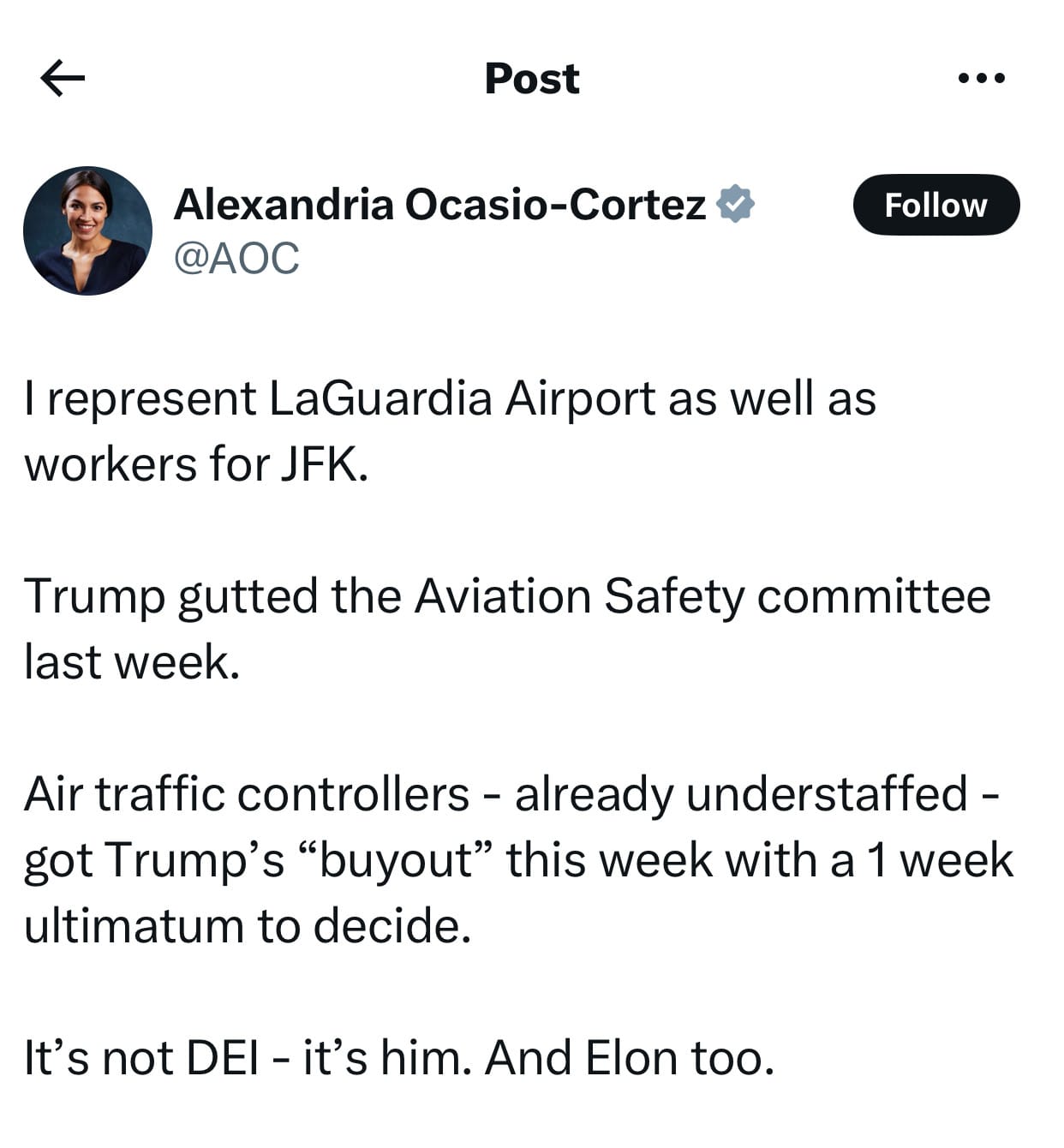 And elected Democrats, if you're listening, please stop playing defense and, like Alexandria Ocasio-Cortez – the only congressional Democrat who truly gets it – go on offense. Call this week's plane crash what it is: Not the consequence of a woman or black person having a government job, but the direct result of the chaos President Musk has sown in his hostile takeover of the United States.