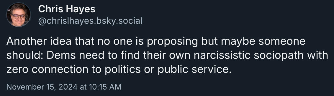 MSNBC host Chris Hayes, a BlueSky poster from way back, recently went so far as to say the left should find its own Trump. I would propose California Governor Gavin Newsom, who seems unhinged enough to frighten even the freaks on the far right, but I suppose his background in politics would disqualify him here. There's also the issue of Newsom alienating huge swaths of the American left with his embrace of anti-trans rhetoric and commitment to popularism, the loser's holy grail.