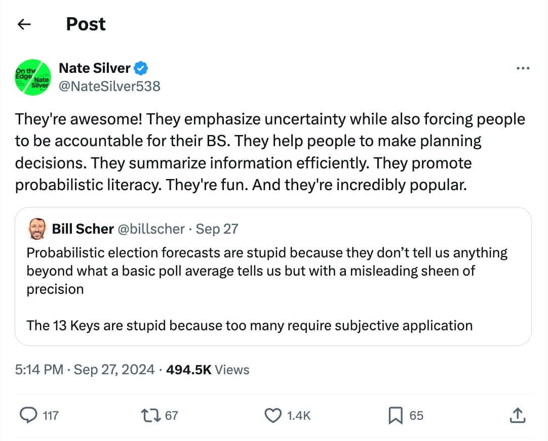 Have you ever, for one second, considered actually watching the game? Or perhaps examining what the combatants themselves are signaling? You are obsessing over “crosstabs,” ”nonresponse bias,” “voter bleed,” and “middle west singularity.” (I’m pulling these from memory, they might not all be industry standard jargon).