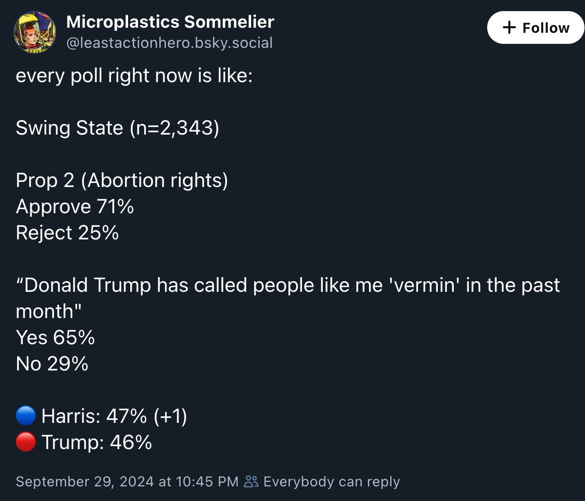One candidate is saying, “The economics … we must build an America where everyone can economy!” The other is making hyper-specific pledges to repeal taxes that might not even exist. (“Folks, we are going to eliminate the horrible truck nuts tax. You will no longer be taxed for your beautiful truck nuts.”) One senses a big tent coming together. The other, walls closing in so fast that there is no promise too desperate to make if it churns up another voter or two. One is running out the clock, the other is throwing rocks at it. Are these two behaving as if the race is a toss up?