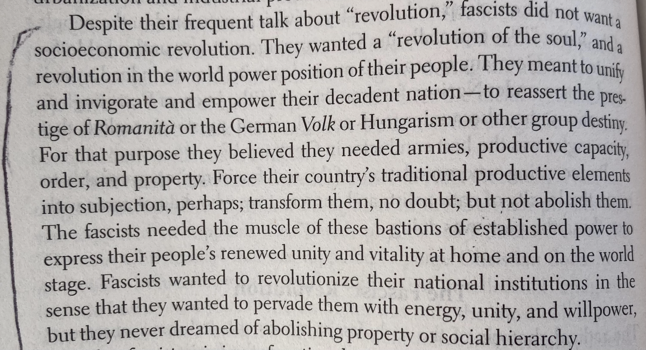This pattern is discussed in agonizing and clarifying detail in Robert Paxton’s Anatomy of Fascism, which seeks to define what exactly makes a fascist movement. The book draws on the only two successful fascist movements in recorded history: Mussolini’s Italy and Hitler’s Germany. In both cases, Dear Leader thrilled their early supporters – working class men who had fought in the First World War – with promises of revolution. The “deadlock or collapse of an existing liberal state,” Paxton writes, is the only known avenue to this revolutionary message taking hold in mass politics. Without the crisis that comes from a constitutional system in shambles, there are exceedingly few takers of this revolutionary cause.
