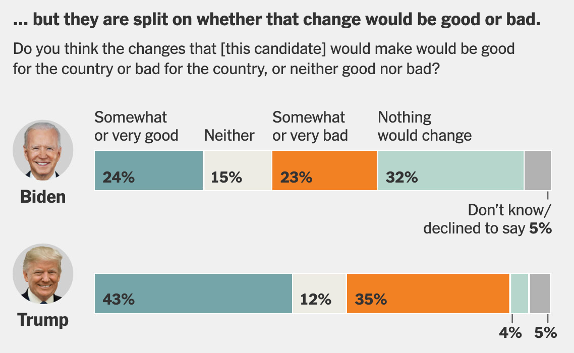 Of course the New York Times doesn’t define what “somewhat or very good” changes means to the people answering their polls. The 45 percent of voters who said Trump – who, by the way, has already served as president – would bring “good” change might very well believe good change includes concentration camps for migrants, prison for women who have miscarriages, a rolling back of all well-meaning climate policies, and nonstop show trials for enemies of the Leader. All we know is that the trials will be compelling and the ratings will be huge.