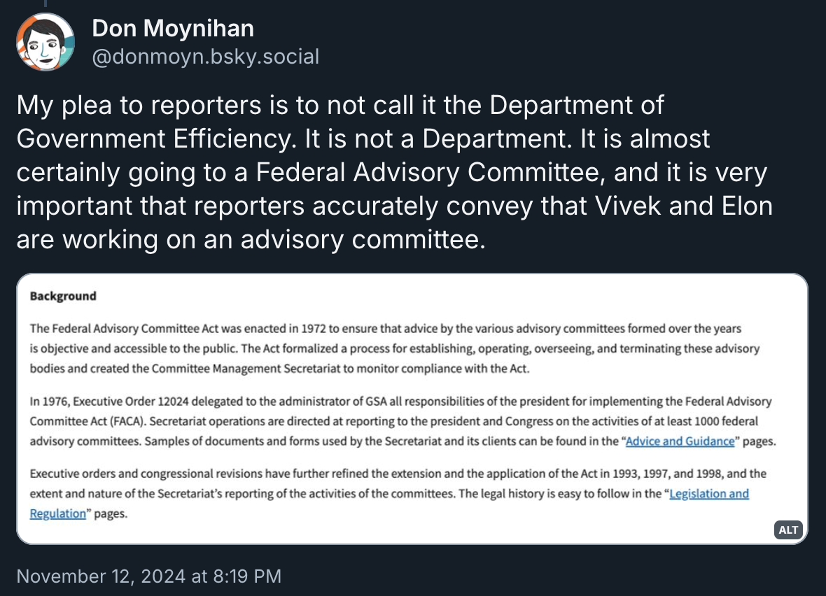 It's clear what's happening here. Trump needed to reward Musk for operating a propaganda arm of the Trump campaign and shoveling resources into the operation throughout the summer and fall. Giving Musk a cute little job will also keep him out of Trump's hair. It's like when I ask my kids to make a pile of leaves for no particular reason so I can read a few more pages of my book.