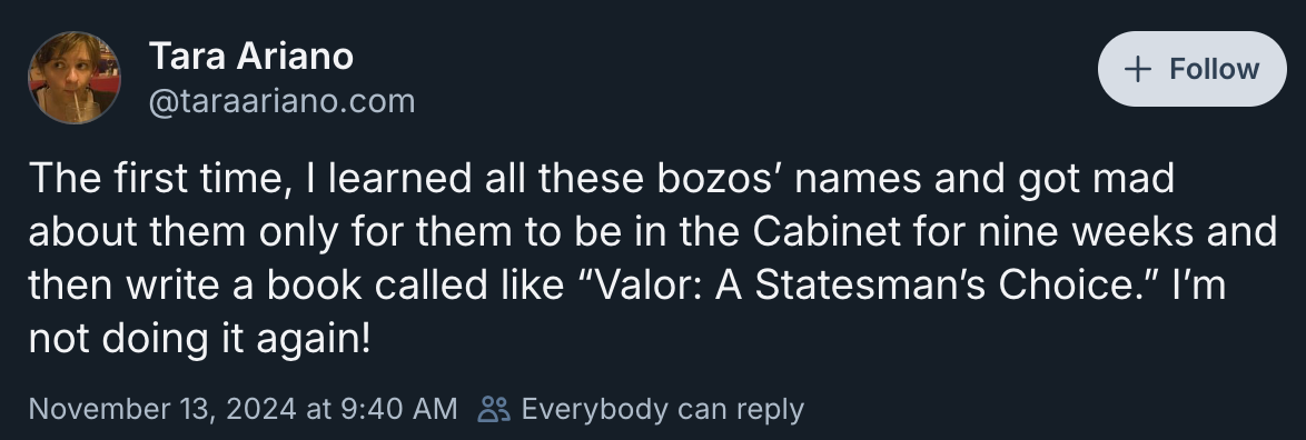 Maybe Senate Republicans ignore the political heat and get Hegseth through the chamber by a vote or two. Hegseth, a talk show host, then has to cow the entire United States military if he’s going to do the worst shit imaginable (the stuff that kept me up last night). I’m not sure that’s likely. There’s also the little matter of Trump claiming he will purge the military brass of anyone insufficiently loyal to Dear Leader. A short history of coups will tell you that military purges are a quick path to an overthrown government (this is not a desired outcome, but it has been reality in many authoritarian regimes). Good luck to Big Boy.
