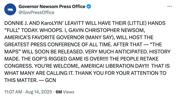 Someone on Bluesky – a Californian far more familiar with Newsom than me, a simple Marylander – explained the governor this way: He loves himself and he loves hunting Republicans. You see the former in the way Newsom presents himself, and you see the latter in the way he has taken such childlike glee in gerrymandering the fuck out of California's electoral maps to create at least five more House seats for Democrats in 2026. Republicans have cried about the unfairness of such a scheme and Newsom has responded with a big smile and a fuck you. As an elder millennial who for decades has so desperately wanted elected Democrats to be mean to Republicans, it's a nice little twist to see a Democrat take such immense pleasure in tormenting his opponents. Forget Newsom's (many) shortcomings for a moment: This is good. This is what we need.