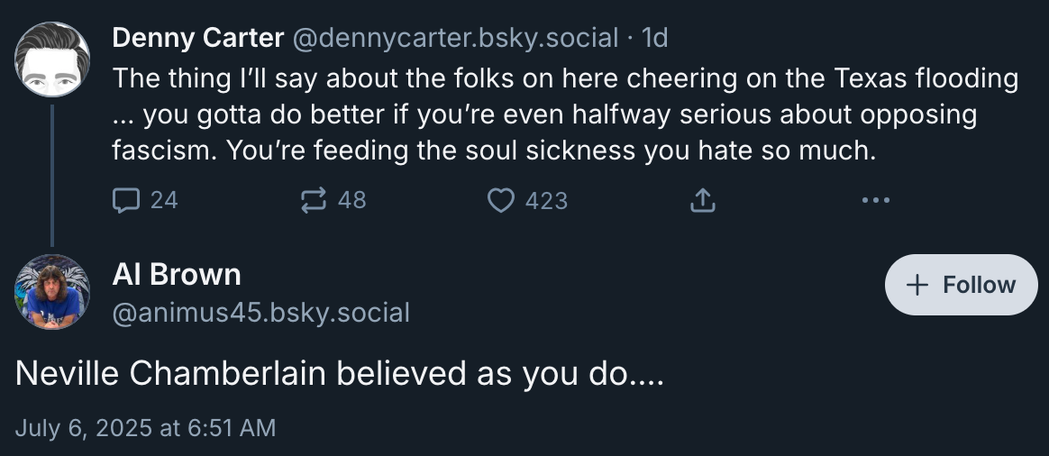 These people say I just don’t understand. They’re calling me the Neville Chamberlain of Bluesky because I suggested liberals and leftists shouldn’t engage in the wanton bloodlust that has been a hallmark of far-right politics for generations. I suppose like Chamberlain, I am appeasing fascists when I say we should take no pleasure in death and misery of regular folks going about their everyday lives when floodwaters take them away because Musk’s DOGE menace gutted the services that would have coordinated warnings for those in the water’s path.