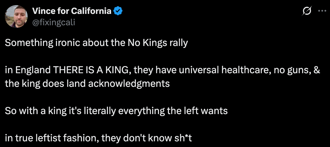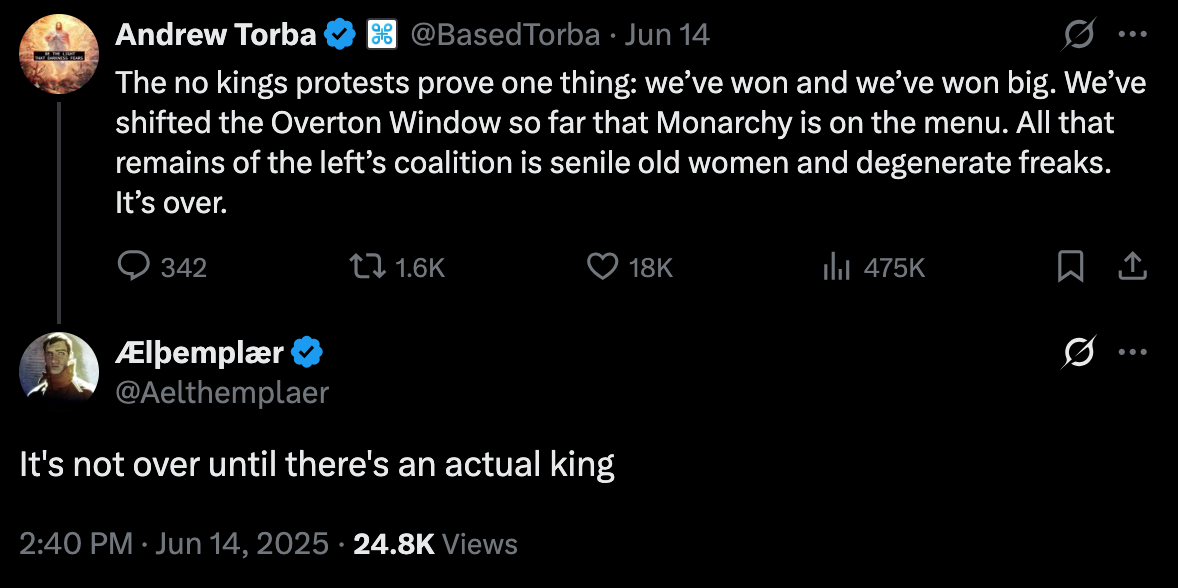 American conservatives watched this outpouring of pushback against the Trump regime’s (mostly) unchecked authoritarian impulses and they said hey look, monarchy is in the range of outcomes now. These folks gathering in solidarity across the country rejecting the idea of an unaccountable, all-powerful ruler are confirming my priors! They watched the political engaged and unengaged alike say no to the idea of a king and they said this is actually good for my backward, anti-human politics.