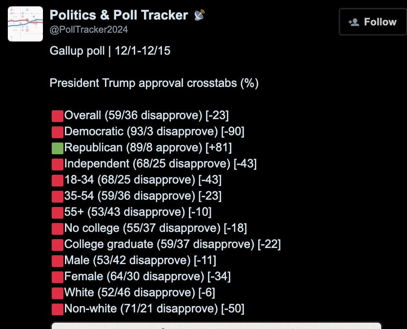 As we enter 2026, you can (and should) take heart in understanding the extent to which Trump's support has eroded since the heady days of February 2025. The 2024 Trump electorate was an illusion, never real, generated by powerful social media algorithms used by his allies to usher him back into power. That winning coalition is no more: Latino men and zoomer bros are apparently out on the country's first tyrant. So we have that going for us, which is nice.