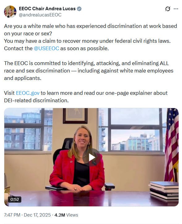 The regime's USEEOC is operating deep within an unreality in which white Americans have been brutally suppressed in the workplace since the racial justice uprisings of 2020. The diversity programs that proliferated in the aftermath of 2020 – that DEI existed for years before this never enters the discourse – crushed the economic prospects of white workers in in the US, according to the right's unreality.