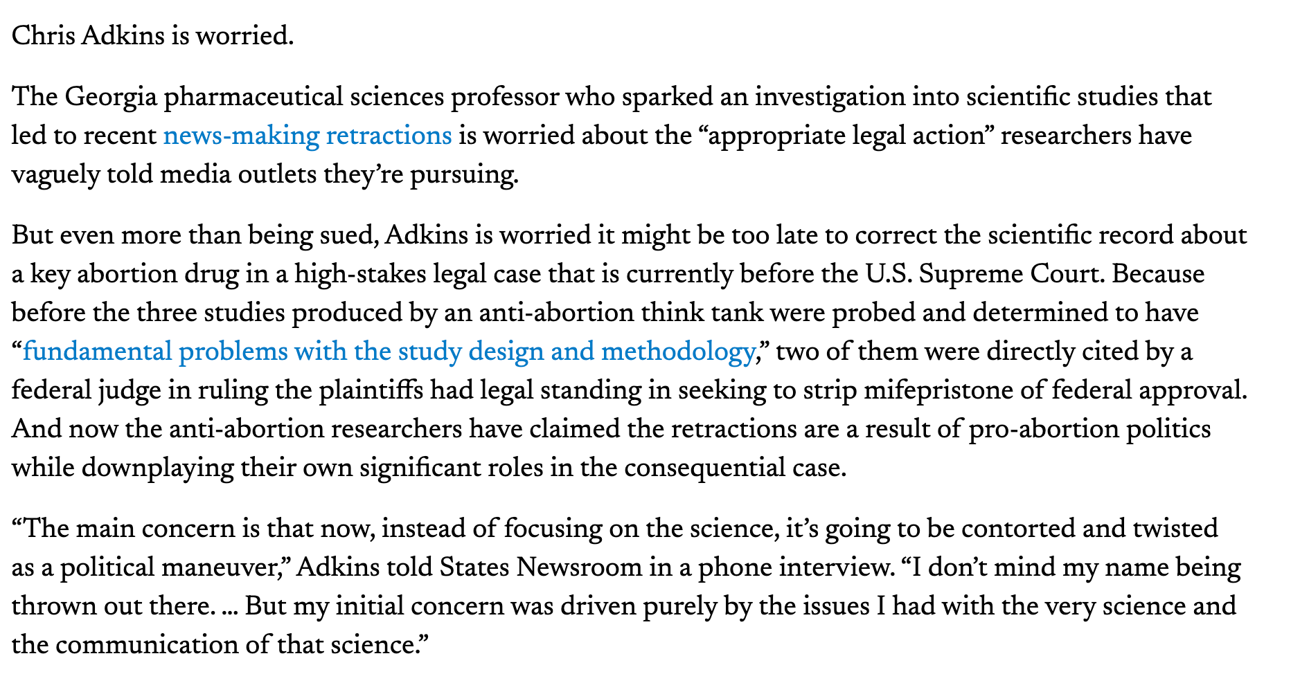 Sofia Resnick, a former colleague of mine at Rewire, recently detailed efforts to retract right-wing studies about the supposed dangers of medication abortion, which has become even more important in the post-Roe American health care landscape. Academic publisher Sage Journals in February retracted three studies from the Charlotte Lozier Institute, among the nation’s leading anti-abortion organizations. The folks who wrote the research papers in question – published between 2019 and 2022 – are affiliated with “pro-life advocacy organizations that explicitly support judicial action to restrict access to mifepristone,” and plaintiffs or expert witnesses in the a lawsuit stemming from the Lozier studies charging medication abortion was not, in fact, safe (it is). A key part of this bad-faith game is pretending one is a disinterested third party when one is in fact a frothing-at-the-mouth activist. It's an effective little trick.