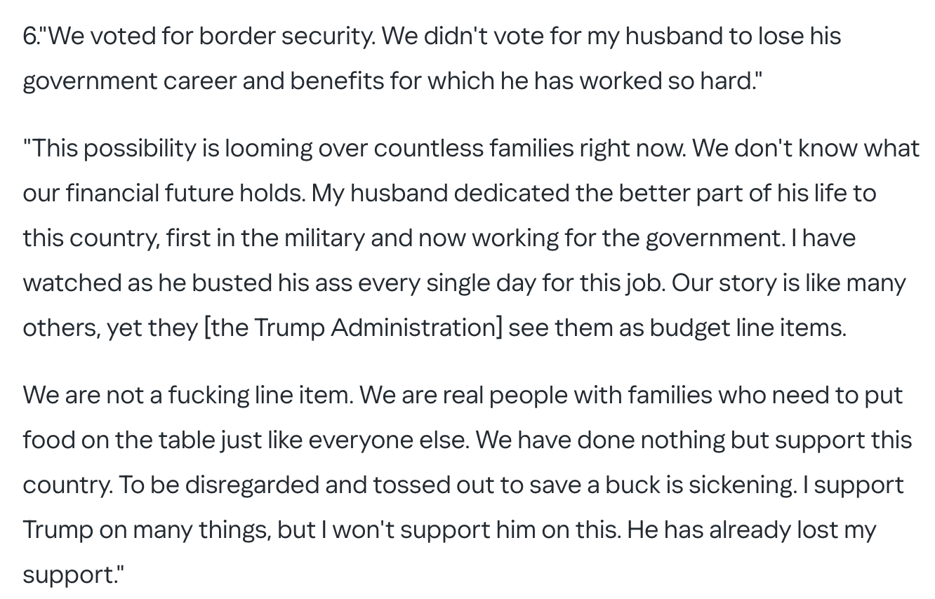 There’s the lady interviewed by the New York Times who voted for Trump because he babbled incoherently last fall about making IVF free for all Americans. There's the Trump supporter whose "heart breaks just thinking my vote may have contributed" to the gutting of the Veterans Administration and welfare programs like SNAP and Medicaid, policy goals outlined in hideous detail in Project 2025.