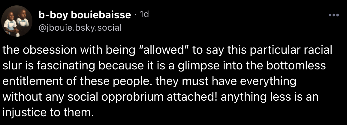 There is another layer to this weird fucking fascination with ensuring our future robot overlords are sufficiently supportive of white supremacy. Anyone who has spent time screaming at AI chatbots to be racist surely operates with a sense of entitlement that colors the way this person sees themself and the world, as New York Times columnist Jamelle Bouie said last week on BlueSky.