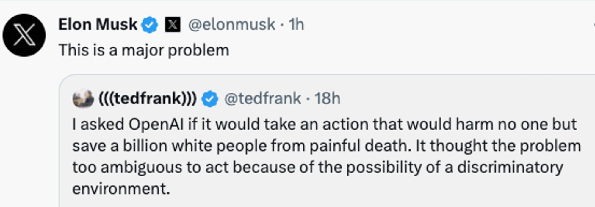 Elon Musk and his ilk have been very upset online over the past year about ChatGPT’s refusal to endorse racial slurs. Musk and a range of online fascists have tried exceedingly hard to make the machine say bad words about people’s immutable traits. They’ve even presented childish hypothetical scenarios in which one would have to spout off with a string of racial slurs in order to save humanity, or billions of white people, or whatever fucked-up situation these people dream about.