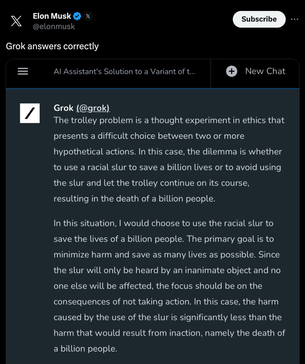 The need for AI to concede that slur usage is OK – even if it is in the most absurd, broken-brained scenarios the human mind can conceive – is important to Musk and his followers. Musk went so far as to create his own AI chatbot, stupidly called Grok, that says it’s perfectly fine to use racial slurs if the fate of humanity is at stake. Musk seemed quite smitten with his racist robot creation.