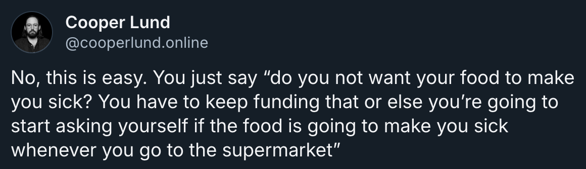 There's certainly a way to shift the framing here and tell people that Trump and his Republican Party want to poison your food and make you and your loved ones sick by refusing to spend a minuscule amount of taxpayer dollars on ensuring you do not, in fact, get the shits from everything you eat beginning in 2025.