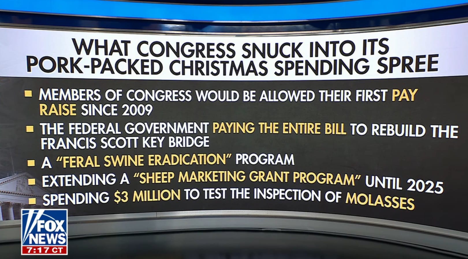 Someone has posted a screen grab of a Fox News segment about what the right would call wasteful spending packed into the continuing resolution that would keep the federal government running for the next few months. Part of the right’s attack on the bill – derided as a leftist wishlist even though far-right House Speaker Mike Johnson put the thing together – was that it contained $3 million for the study of molasses.