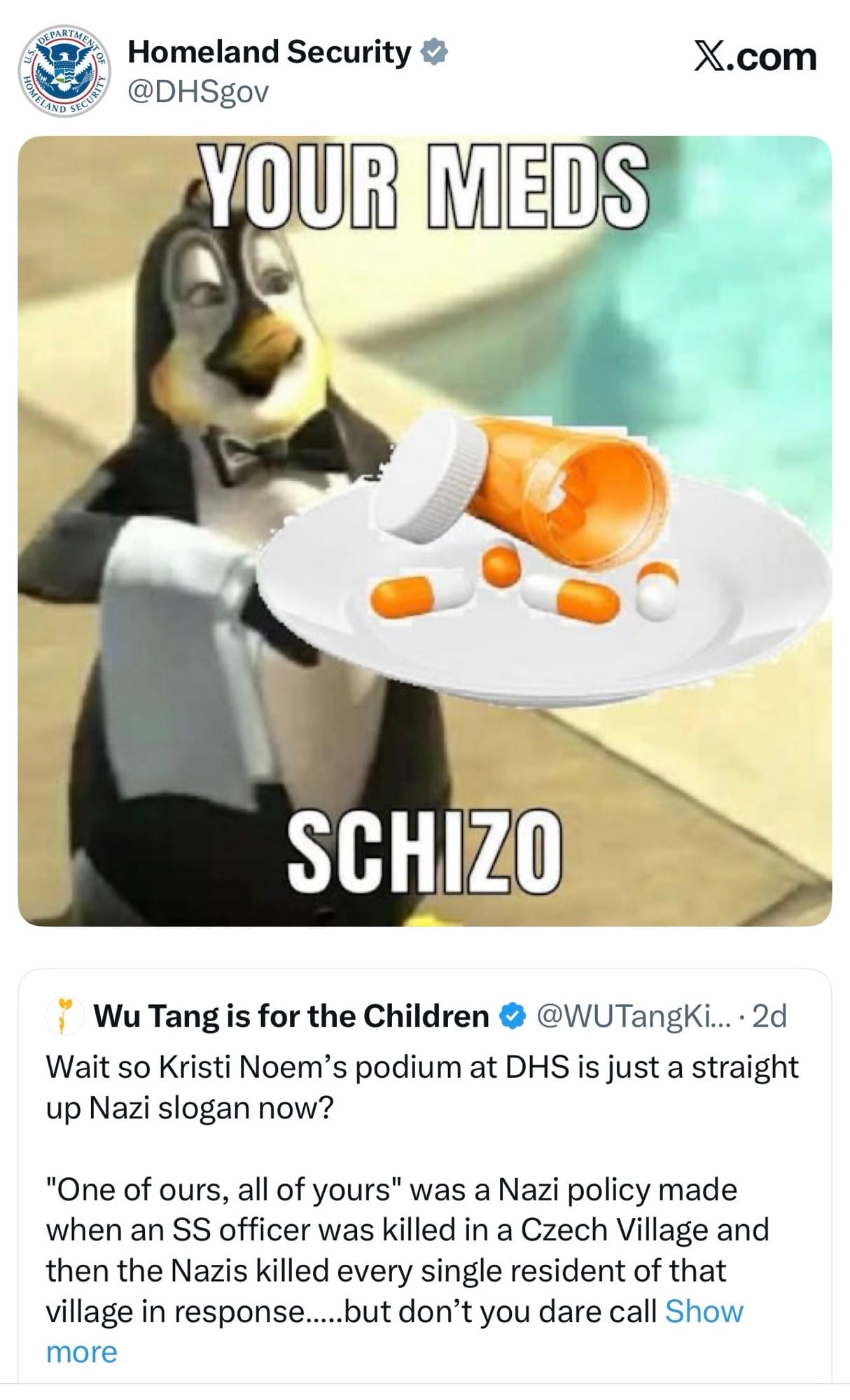 And if you saw Noem’s use of this genocidal phrase and rightfully got worked up about it and tried to explain all this to someone who has a loose grasp on Nazi-era Germany, you will sound crazy, unhinged, unwell. Making the connection between previous fascist regimes and the current fascist American regime will not make you sound smart of insightful or erudite; it will make you sound like you have lost your entire mind.