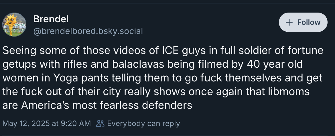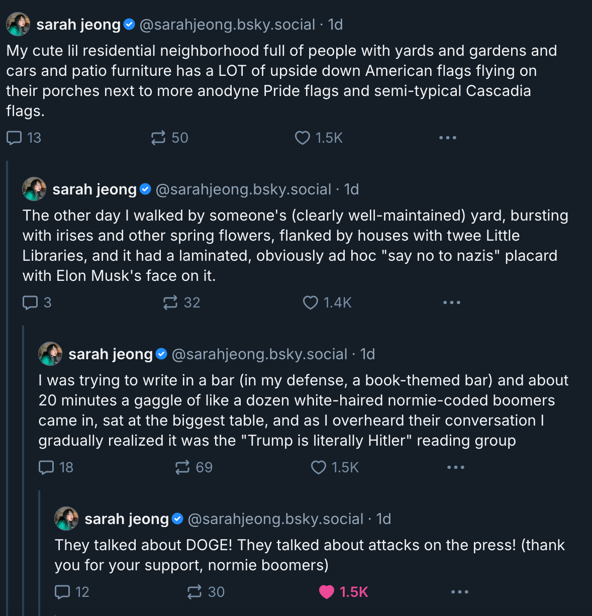 Folks are not asking how Democrats might be able to convert a few thousand Midwestern Trump backers for the next presidential election. They are asking how we should approach an unprecedented constitutional crisis in a political environment without a unified opposition party (there are more than a few indications this could change after the midterms, with so many calcified, useless Democrats bowing out). These are normies asking these questions. They are not avowed leftists citing Karl Marx on Bluesky. These are not academics drawing inspiration from the history of anti-fascist movements. These are normies, people who would rather be living their lives than centering their existences on opposing the authoritarian menace that has descended on us all, even those who are blissfully unaware of the changes in the air.