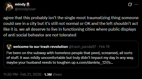 It turns out almost three years to the day after this legendarily controversial post, Isser was embroiled in an almost identical debate about antisocial behavior in public spaces. The response to both posts elicited the same arguments: Isser is too soft, she hates the unhoused, she should move out of the city if she wants to avoid people masturbating on public transit.
