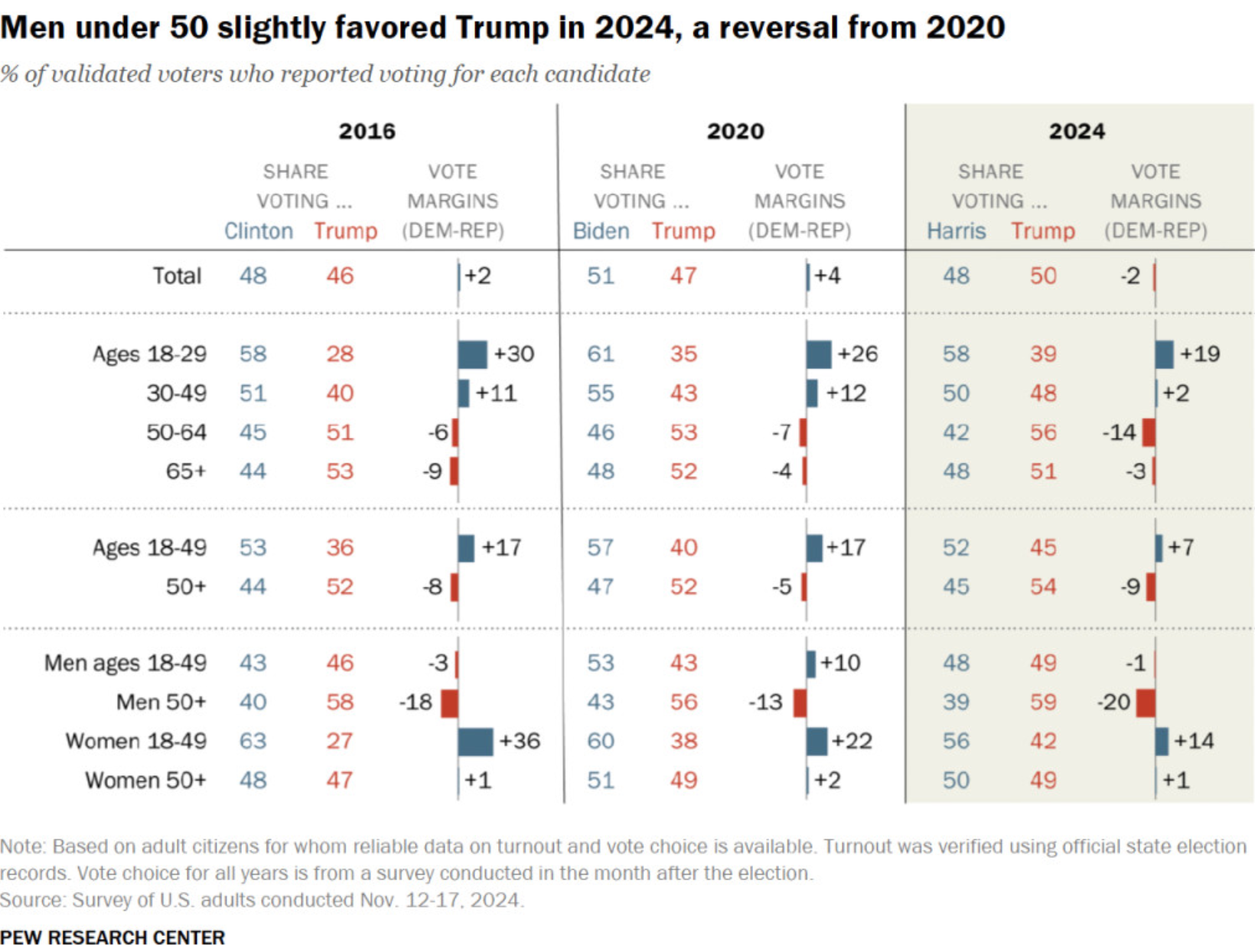That millennial solidarity against the forces of reactionary politics seems to have faded in this second (final?) portion of the Trump era. It's part of a larger trend among men in the US: After Joe Biden won men younger than 50 by ten points in 2020, Trump won this cohort by a point in 2024. It's an enormous swing, an unconscionable swing if you ask me.